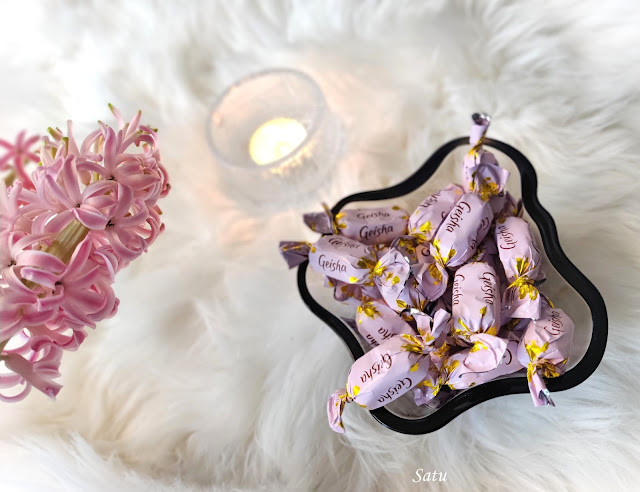 Nytku - Nyt kun nuo yllä olevissa kuvissa olevat suklaat on syötä ja puikoilla olleet pikkusukat neulottu (laitan kuvia niistä erikseen myöhemmin), on olo itse asiassa ihan tyytyväinen. Tyytyväinen siihen, että jotain pitkään kesken ollutta on valmistunut ja käsityökorista jälleen yksi keskeneräinen neule saatettu valmiiksi ennen kuin aloitin uuden.